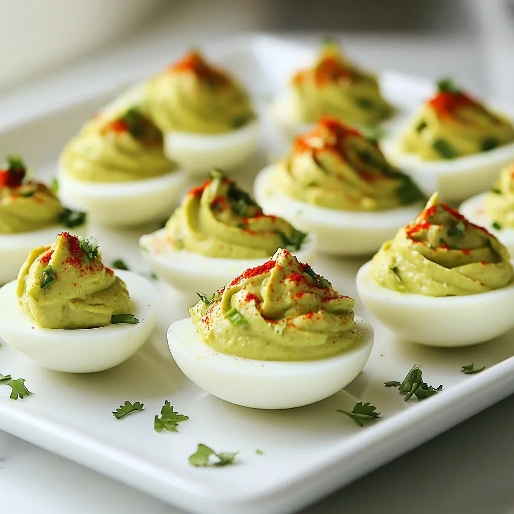 - 6 large eggs - 1 ripe avocado - 2 tablespoons Greek yogurt - 1 tablespoon fresh lime juice - 1 teaspoon Dijon mustard - 1 clove garlic, finely minced - Salt and freshly ground black pepper, to taste - Paprika, for dusting - Fresh cilantro or chives, finely chopped, for garnish Gathering these ingredients is your first step. Each one plays a key role in making your avocado deviled eggs a hit. The eggs provide a sturdy base. The avocado brings creaminess and a fresh taste. Greek yogurt adds tang and a nice texture. Lime juice gives a zesty kick. Dijon mustard adds a bit of depth. Garlic gives it a punch of flavor, while salt and pepper balance it all. Finally, paprika and herbs make it pretty and tasty. Using fresh ingredients makes a big difference. Choose ripe avocados for the best flavor. Fresh herbs add vibrant color and aroma. With these ingredients, you’re set for a delightful treat that everyone will love! {{ingredient_image_2}} To boil the eggs correctly, place them in a medium pot. Cover the eggs with cold water until they are fully submerged. Heat the pot over medium heat. Bring the water to a gentle boil. Once it bubbles, cover the pot and remove it from the heat. Let the eggs sit in the hot water for 12 minutes. This method gives you perfect hard-boiled eggs. Use a quick cooling method to stop the cooking. After 12 minutes, move the eggs to a bowl filled with ice water. Let them sit for about 5 minutes. This will cool the eggs and make peeling easier. To peel the eggs, gently tap each one on a flat surface. Roll it lightly to crack the shell. Peel under running water to help remove the shell smoothly. Now it's time to make the filling. Slice each cooled egg in half lengthwise. Carefully scoop the yolks into a medium mixing bowl. Add one ripe avocado, two tablespoons of Greek yogurt, one tablespoon of fresh lime juice, one teaspoon of Dijon mustard, and one clove of finely minced garlic. Add a pinch of salt and black pepper for flavor. Use a fork or potato masher to blend everything until smooth and creamy. This step is key for a great texture. When the mixture is ready, you need to fill the egg whites. You can use a spoon for this or a piping bag fitted with a decorative tip. I recommend using a piping bag for a neat look. Generously fill each egg white half, creating a nice mound on top. This will make the eggs look more appealing. For the final touches, lightly dust the filled eggs with paprika. This adds color and flavor. Sprinkle finely chopped cilantro or chives on top for a fresh touch. The garnishes make the eggs look and taste even better. Arrange your deviled eggs on a serving platter. You can serve them right away or chill them briefly in the fridge for a cool treat. To avoid overcooking eggs, start with cold water. Place the eggs in a pot, then cover them with cold water. Turn on the heat to medium and bring it to a gentle boil. Once boiling, take the pot off the heat and cover it. Let the eggs sit for 12 minutes. This ensures firm yolks without the gray ring. For a creamy texture, use a ripe avocado. It should be soft but not brown. Adding Greek yogurt helps create a smooth filling. Mash the yolks and avocado well until they blend into a creamy mix. If you want it even creamier, use a hand mixer for a few seconds. You can spice things up with a few tasty additions. Try adding paprika or cayenne for a kick. Smoked paprika gives a nice twist too. If you want to switch things up, consider adding fresh herbs like dill or tarragon. To customize your avocado mixture, think about adding ingredients like lemon zest or a dash of hot sauce. This can give your deviled eggs unique flavors. A touch of crumbled bacon or even blue cheese can take it to another level. If you want healthier options, try using non-fat Greek yogurt. For a vegan twist, swap Greek yogurt with mashed silken tofu. It adds creaminess without dairy. You can also use avocado oil instead of yogurt for a lighter mix. For those who want a non-dairy option, try coconut yogurt. It has a mild flavor and works well with avocado. Just make sure to choose unsweetened yogurt to keep the taste balanced. Pro Tips Perfectly Boiled Eggs: For the best results, use eggs that are a few days old. Fresh eggs can be harder to peel due to their lower pH levels, which makes the membrane stick to the shell. Avocado Ripeness: Make sure your avocado is perfectly ripe for the best flavor and creaminess. It should yield slightly to gentle pressure when squeezed. Enhance Flavor: Experiment with additional seasonings such as cumin or cayenne pepper in the avocado mixture for a unique twist on the classic deviled egg. Presentation Matters: Use a piping bag to fill the egg whites for a professional look. If you don’t have one, a plastic bag with a corner snipped off works just as well! {{image_4}} To make your avocado deviled eggs spicy, add jalapeños or sriracha. These ingredients bring a nice heat. You can adjust the amount based on your taste. For a fun twist, mix in your favorite hot sauce. It adds a great kick. The creaminess of avocado balances the spice perfectly. For a Mediterranean twist, try feta cheese or olives. These flavors give a rich and salty taste. You can also add fresh herbs like dill or parsley. They brighten the dish and add freshness. This variation is perfect for those who love bold flavors. It makes your deviled eggs stand out at any gathering. If you like sweet and savory, add bacon or sweet chili sauce. Crumbled bacon gives a crunchy texture. Sweet chili sauce adds a nice, sticky sweetness. Pairing your eggs with fruits like mango adds a unique taste. This combo surprises your guests and keeps them coming back for more. To keep your Avocado Deviled Eggs fresh, store them in the fridge. Use a tight-sealing container to prevent drying out. Cover the eggs with plastic wrap if you don’t have a container. This keeps them moist and tasty. - Use an airtight container or plastic wrap. - Store in the fridge for 