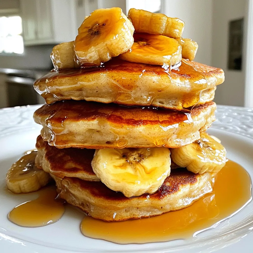 Create an enticing pancake stack on a plate, layering each pancake with caramelized bananas. Finish with a generous drizzle of warm maple syrup and a sprinkle of cinnamon.