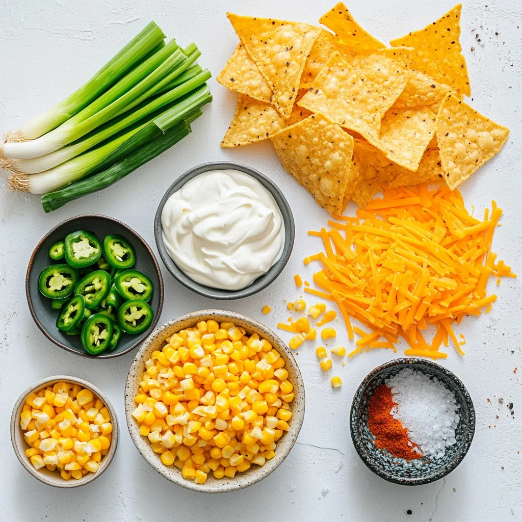The main ingredients create a creamy base for the dip. Canned corn adds sweetness. Cream cheese gives richness, while sour cream adds tang. Sharp cheddar cheese offers a bold flavor. Jalapeños bring heat. Green onions add freshness and crunch.