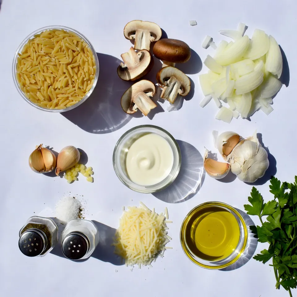 To make creamy mushroom orzo, start by gathering your ingredients. You’ll need orzo pasta, vegetable broth, mushrooms, onion, garlic, heavy cream, Parmesan cheese, olive oil, salt, and pepper.