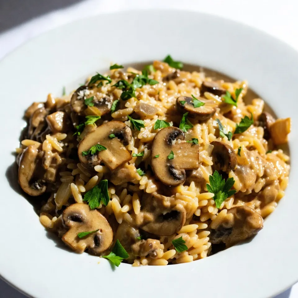 A rich and creamy orzo dish with sautéed mushrooms and a touch of Parmesan.