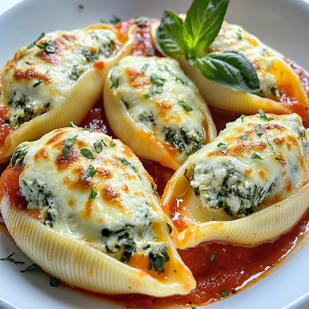 - 20 large jumbo pasta shells - 2 cups ricotta cheese - 1 cup shredded mozzarella cheese, divided - 1/2 cup grated Parmesan cheese - 2 cups fresh spinach, finely chopped - 1 large egg - 2 cloves garlic, minced - 1 teaspoon dried oregano - 1/2 teaspoon salt - 1/4 teaspoon freshly ground black pepper - 2 cups marinara sauce To create creamy spinach stuffed shells, you need some key ingredients. The large jumbo pasta shells hold the rich filling well. I use ricotta, mozzarella, and Parmesan for a mix of flavors. The ricotta gives creaminess, while mozzarella adds stretch. Parmesan offers a sharp contrast. Spinach is essential too. Fresh spinach adds color and nutrients. Garlic and oregano help to enhance the taste. Salt and pepper balance the flavors. Finally, marinara sauce layers in a rich tomato base that pairs perfectly with the stuffed shells. - Red pepper flakes for heat - Fresh herbs for garnish You can customize your dish with optional ingredients. If you like heat, add red pepper flakes to the filling. For a fresh touch, garnish with basil leaves before serving. These small tweaks can make a big difference in flavor and presentation. {{ingredient_image_2}} 1. First, preheat your oven to 350°F (175°C). This ensures even cooking later on. 2. Next, bring a large pot of salted water to a boil. Add your jumbo pasta shells and cook them until they are al dente. This usually takes about 9-11 minutes. 3. Once cooked, drain the shells and rinse them under cold water. This stops the cooking process and helps keep them from sticking together. 1. In a large mixing bowl, combine the ricotta cheese, half of the shredded mozzarella, and grated Parmesan cheese. 2. Add the finely chopped spinach, a large egg, minced garlic, dried oregano, salt, black pepper, and optional red pepper flakes for heat. 3. Stir all the ingredients together until you get a creamy mixture. Make sure it’s well blended for the best flavor. 1. Start by pouring a thin layer of marinara sauce into the bottom of a 9x13 inch baking dish. This keeps the shells moist. 2. Carefully stuff each cooked pasta shell with the creamy spinach filling. Use a spoon to pack the filling in well. 3. Place the stuffed shells in a single layer over the marinara sauce in the dish. 4. Drizzle the remaining marinara sauce over the shells, ensuring they are covered well. 5. Sprinkle the rest of the shredded mozzarella cheese on top for a cheesy finish. 6. Cover the baking dish tightly with aluminum foil. This keeps moisture in while baking. 7. Place the dish in the preheated oven and bake for 25 minutes. 8. After 25 minutes, carefully remove the foil. Return the dish to the oven and bake for another 10-15 minutes. Look for bubbling and golden cheese on top. 9. Once done, take the dish out and let it cool for about 5 minutes before serving. 10. For a fresh touch, add a few fresh basil leaves on top just before serving. This adds color and flavor. To get the best texture, cook the pasta shells until they are al dente. This means they should be firm but not hard. Follow the package instructions closely. After cooking, drain the shells and rinse them under cold water. This stops the cooking and helps them not stick together. When it comes to marinara sauce, an even spread makes a big difference. Pour a thin layer at the bottom of the dish first. Then, after stuffing your shells, drizzle the remaining sauce on top. Use a spoon to cover each shell well. This keeps them moist while baking. For leftovers, store the stuffed shells in an airtight container in the fridge. If you want to keep them fresh, cover them tightly. They will last about three days. When reheating, use the oven for the best results. Preheat the oven to 350°F (175°C). Place the shells in a baking dish and cover with foil. Bake for 15 to 20 minutes. This keeps the cheese creamy and prevents the pasta from drying out. Pro Tips Choose the Right Shell: Jumbo shells are ideal for this recipe, but you can also use manicotti pasta if you prefer a slightly different shape. Make it Ahead: You can prepare the stuffed shells a day in advance. Just cover them tightly with foil and refrigerate until you're ready to bake. Add Extra Veggies: Feel free to mix in other vegetables like mushrooms, zucchini, or bell peppers into the filling for added flavor and nutrition. Rest Before Serving: Allow the stuffed shells to rest for about 5 minutes after baking. This helps the filling set and makes serving easier. {{image_4}} You can swap in other veggies if you want to mix it up. Try adding: - Chopped bell peppers - Sautéed mushrooms - Zucchini or yellow squash - Artichoke hearts These options boost flavor and add texture. Each veggie brings new tastes to your dish. You can also use different greens like kale or Swiss chard. They work great with the creamy filling. If you need gluten-free options, use these pasta shells: - Brown rice pasta shells - Chickpea pasta shells - Corn pasta shells These choices keep the dish gluten-free without losing taste. For cheese, you can choose low-fat options such as: - Part-skim ricotta - Low-fat mozzarella - Vegan cheese alternatives Using these substitutions makes the dish lighter but still creamy. Each option helps you enjoy this meal while sticking to your diet. Creamy spinach stuffed shells are a hit on their own, but pairing them enhances the meal. Try these sides: - Garlic Bread: The crunch and flavor of garlic bread balance the creamy shells. - Caesar Salad: Crisp romaine, croutons, and dressing make a fresh side. - Roasted Vegetables: Carrots and zucchini bring color and a sweet taste. - Steamed Broccoli: This green veggie adds nutrition and a nice crunch. These sides complement the rich flavors of the stuffed shells. They also add texture and freshness to your plate. How you present your dish can impress your guests. Here are some tips to make your creamy spinach stuffed shells shine: - Garnish with Fresh Herbs: A sprinkle of basil or parsley adds color and fla