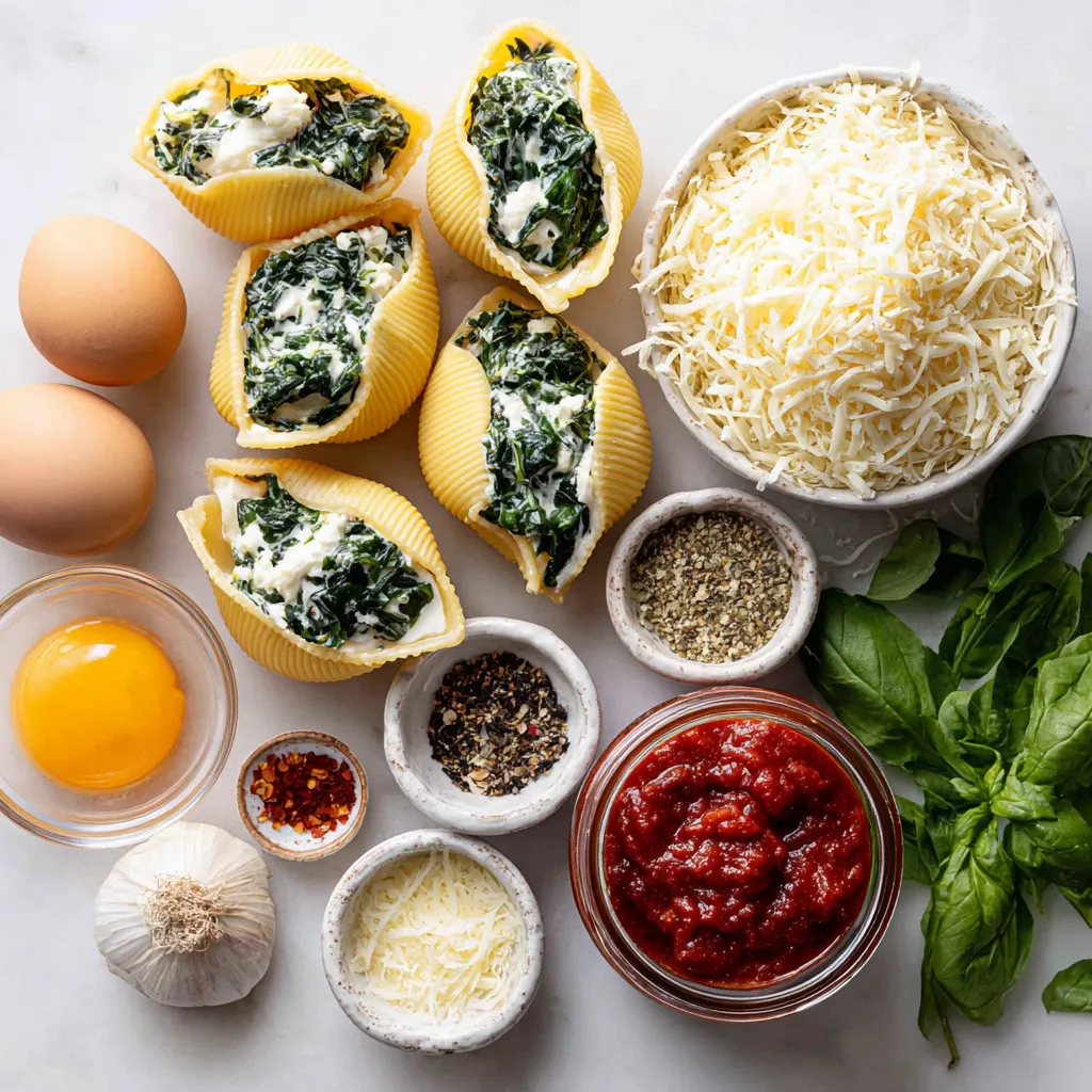To create creamy spinach stuffed shells, you need some key ingredients. The large jumbo pasta shells hold the rich filling well. I use ricotta, mozzarella, and Parmesan for a mix of flavors. The ricotta gives creaminess, while mozzarella adds stretch. Parmesan offers a sharp contrast.