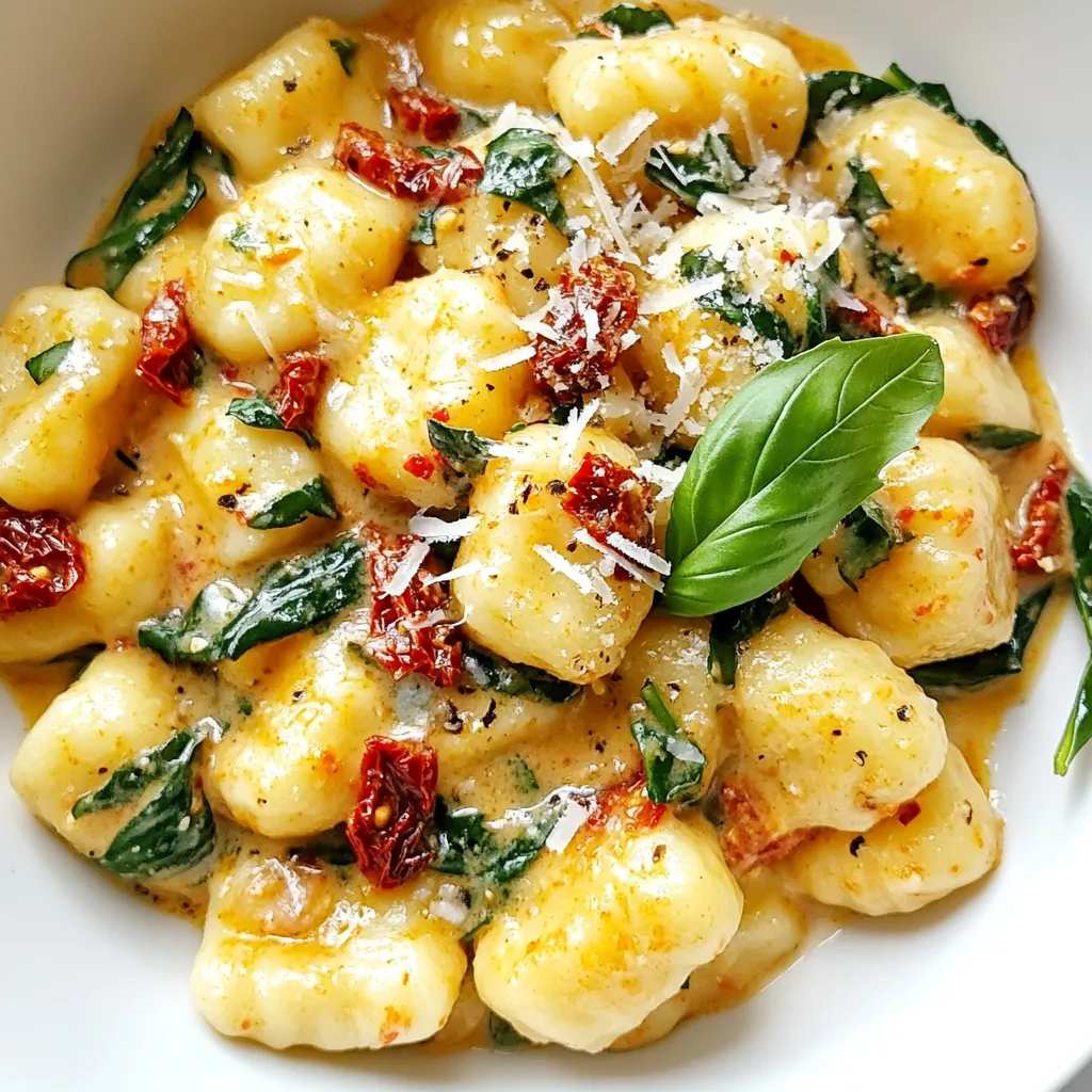 A rich and creamy gnocchi dish featuring sun-dried tomatoes, spinach, and Parmesan cheese.