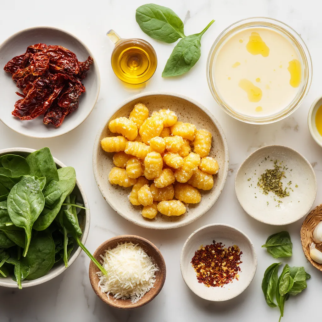 You need these ingredients to create a rich and creamy dish. The gnocchi serves as a soft base. The sun-dried tomatoes add a punch of flavor. Heavy cream gives the sauce its creamy texture. Baby spinach brings in freshness and color. Lastly, Parmesan cheese enhances the taste with a savory finish.