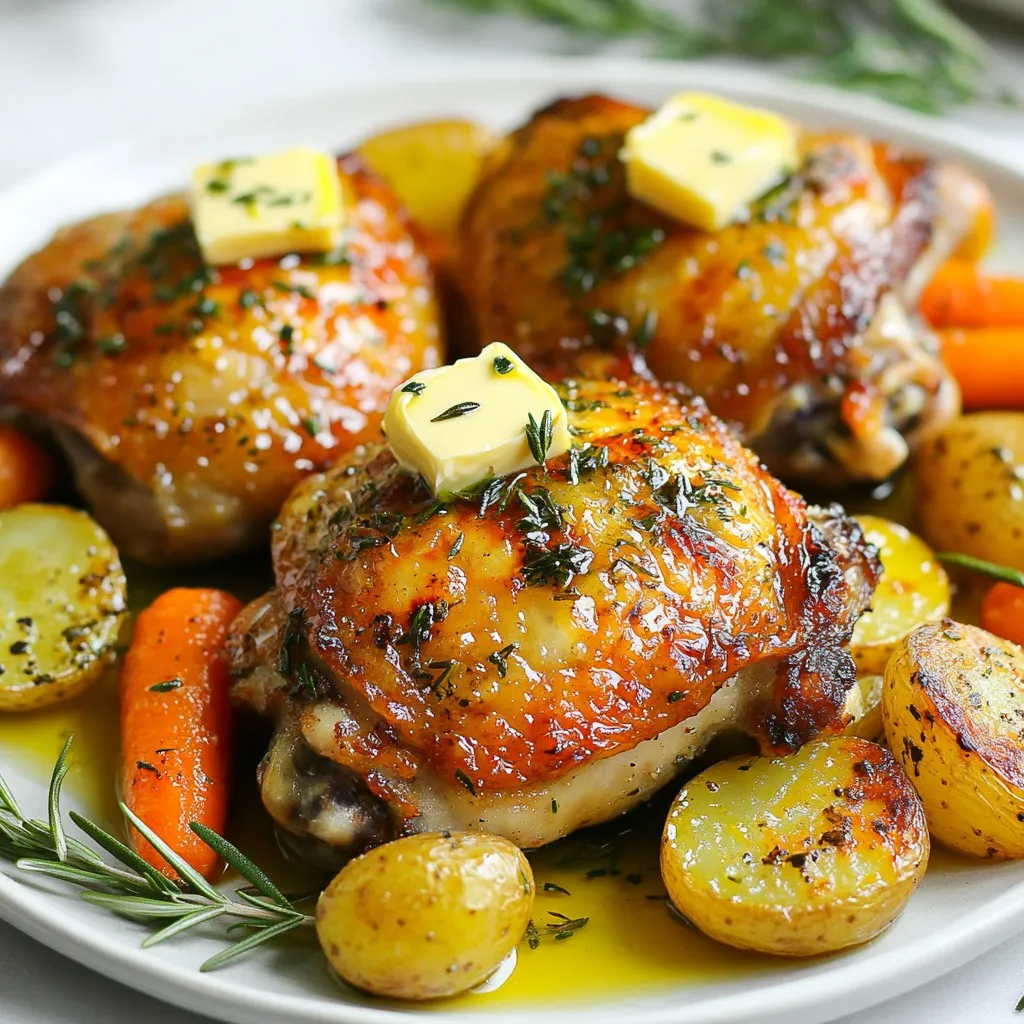 Using bone-in, skin-on chicken thighs gives the best flavor and juiciness. The skin crisps up beautifully, and the meat stays tender. The herb butter, made from garlic and fresh herbs, adds a rich taste. I like rosemary, thyme, and parsley for their lovely aromas.
