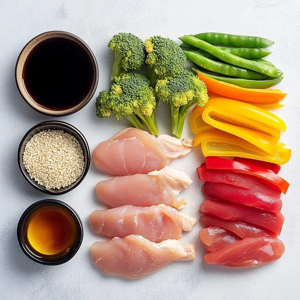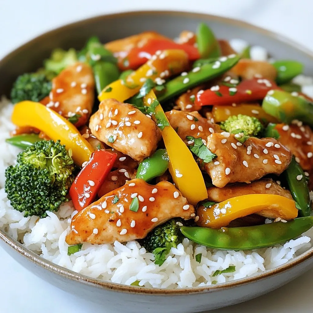 - 1 lb boneless, skinless chicken breasts, thinly sliced - 2 tablespoons honey - 3 tablespoons soy sauce - 2 cloves garlic, minced - 1 tablespoon fresh ginger, grated - 1 cup assorted bell peppers (red, yellow, green), sliced into thin strips - 1 cup broccoli florets, cut into bite-sized pieces - 1 cup snap peas, trimmed - 2 tablespoons vegetable oil (or sesame oil for added flavor) - Salt and pepper to taste - 1 teaspoon sesame seeds, for garnish - Cooked jasmine rice or quinoa, for serving - Choosing Fresh Produce: Always pick bright and firm vegetables. Fresh produce adds great flavor and texture. Look for bell peppers with smooth skin and vibrant colors. Broccoli should be deep green and firm. - Selecting the Best Chicken: Choose chicken that is pink and moist. Avoid chicken with any discoloration or a foul smell. Fresh chicken cooks better and tastes great. - Opting for Low-Sodium Soy Sauce: Low-sodium soy sauce is a smart choice. It allows you to control salt levels while keeping flavor. This option helps avoid overpowering the honey's sweetness. {{ingredient_image_2}} - In a small bowl, whisk together: - 2 tablespoons honey - 3 tablespoons soy sauce - 2 cloves garlic, minced - 1 tablespoon fresh ginger, grated - Mix until smooth and well combined. Set it aside to let the flavors blend. - Heat 2 tablespoons vegetable oil in a large skillet over medium-high heat. - Season 1 pound of sliced chicken with salt and pepper. - Carefully add the chicken to the hot skillet. Cook for 5-7 minutes. - Stir often until the chicken is golden brown and cooked through. It should reach 165°F or 75°C. - Once done, remove the chicken and set it aside on a plate. - In the same skillet, add: - 1 cup assorted bell peppers, sliced - 1 cup broccoli florets - 1 cup snap peas - Stir-fry these vegetables for 3-4 minutes. Cook until they are tender-crisp. - Return the cooked chicken to the skillet. Pour the honey garlic sauce over everything. - Gently toss all ingredients to coat them in the sauce. - Continue cooking for another 2-3 minutes. Allow the sauce to heat through and thicken. - Remove from heat and sprinkle with 1 teaspoon sesame seeds for a nice crunch. - High Heat Cooking For the best stir-fry, always use high heat. This helps the chicken cook fast and keeps it juicy. A hot skillet sears the meat quickly, locking in the flavor. Make sure your oil is hot before adding any food. You can test the heat by splashing a drop of water in the pan. If it sizzles, it’s ready! - Importance of Stirring Stirring is key to a great stir-fry. Move the food around in the pan often. This ensures even cooking and prevents burning. Use a spatula to lift and toss the food. Keep it moving for that perfect stir-fry texture. - Adding More Sweetness or Saltiness You can tweak the flavors to match your taste. If you like it sweeter, add a bit more honey. For saltiness, drizzle in extra soy sauce. Just remember to taste as you go. This way, you won’t overpower the dish. - Spice Options for Heat Want some spice? Add chili flakes or a splash of hot sauce. You can also use fresh chopped chilies for a bold kick. Start with a little and add more if you want it spicier. - Rice vs. Quinoa Serve your stir-fry over jasmine rice for a classic combo. It soaks up the sauce well. If you want something different, try quinoa. It adds a nutty flavor and extra protein. - Garnishing Techniques Garnishing makes your dish look great. Sprinkle sesame seeds on top for crunch. Finely chopped green onions add color and fresh taste. For a fancy touch, use a drizzle of extra honey or soy sauce around the plate. Pro Tips Marinate for Extra Flavor: Let the chicken marinate in the honey garlic sauce for at least 30 minutes (or overnight) before cooking. This will enhance the flavor profile and make the chicken even more delicious. Use Fresh Vegetables: For the best texture and flavor, opt for fresh, seasonal vegetables. This not only makes the dish more vibrant but also adds nutritional value. High Heat for Stir-Frying: Ensure your skillet or wok is very hot before adding ingredients. This helps to achieve that desirable stir-fry char and keeps the vegetables crisp. Customize Your Sauce: Feel free to adjust the sweetness or saltiness of the sauce by adding more honey or soy sauce according to your taste. You can also add a splash of rice vinegar for a tangy twist. {{image_4}} You can change the protein in this dish for a new twist. - Tofu or Tempeh: Both work well in this stir-fry. Use firm tofu, cubed, or tempeh, sliced thin. They soak up the honey garlic sauce nicely. - Other Meats: Try shrimp, beef, or pork. Just adjust cooking times. Shrimp cooks fast, while beef and pork may need a bit longer. Mix and match vegetables for variety. You can use what you have or what's in season. - Seasonal Produce Options: In spring, add asparagus or snap peas. In summer, zucchini and corn are great. Fall brings squash and carrots. Winter is perfect for hearty greens like kale. - Frozen Vegetable Substitutes: Frozen veggies save time. They are just as healthy. Look for stir-fry blends with bell peppers, broccoli, and carrots. You can switch up the sauce for different flavors. - Teriyaki or Peanut Sauce Options: Teriyaki sauce adds a sweet and savory touch. Peanut sauce brings creaminess. Just use the same amount as the honey garlic sauce. - Low-FODMAP Alternatives: If you need a low-FODMAP sauce, use coconut aminos instead of soy sauce. It’s milder and safe for sensitive stomachs. - Refrigeration Tips: Place leftover Honey Garlic Chicken Stir-Fry in an airtight container. Store it in the fridge for up to three days. Make sure to cool the dish to room temperature before sealing. This keeps the flavors fresh and the chicken safe to eat. - Freezing Instructions: If you want to keep leftovers longer, freeze them. Use a freezer-safe container or bag. This dish can stay in the freezer for up to three months. When you're ready to eat, thaw it in the fridge overnight.