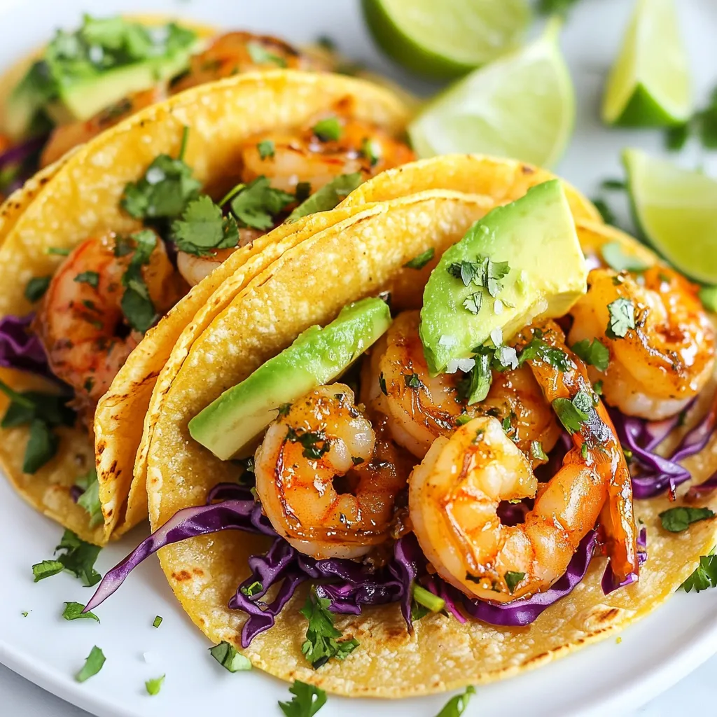 Delicious tacos filled with marinated shrimp, avocado, and fresh cabbage, served with lime.