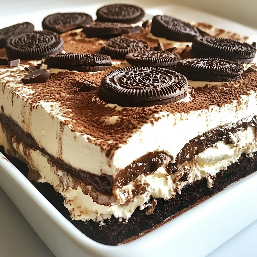 A delicious layered dessert combining chocolate sandwich cookies, coffee, and mascarpone cheese, perfect for any occasion.