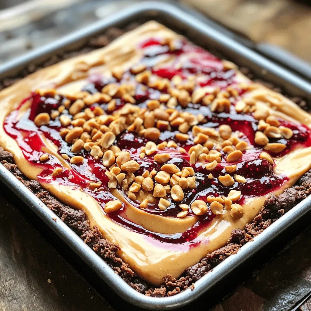 To make these bars, you'll need some key ingredients. Each one plays a big role in flavor and texture. Gather the following: - 1 cup graham cracker crumbs - 1/2 cup unsweetened cocoa powder - 1/3 cup melted coconut oil - 2 cups cream cheese, softened - 1 cup creamy peanut butter - 1/2 cup powdered sugar - 1 teaspoon vanilla extract - 1 cup mixed berry jam (raspberry or strawberry works beautifully) - 1/4 cup crushed peanuts (for garnish) These ingredients work together to create a creamy, rich, and delicious bar that everyone will love. The graham cracker crumbs and cocoa powder create a tasty crust. The mix of cream cheese and peanut butter gives the cheesecake layer a smooth texture. While the bars are great as is, you can add some fun toppings! Here are a few ideas: - Fresh berries (strawberries, raspberries, or blueberries) - Whipped cream for a fluffy touch - A drizzle of chocolate sauce for extra sweetness - More crushed peanuts for added crunch These toppings can make your dessert even more appealing. Feel free to mix and match to suit your taste. Knowing what you eat is important. Each serving has: - Calories: 250 - Total Fat: 18g - Saturated Fat: 8g - Cholesterol: 30mg - Sodium: 150mg - Total Carbohydrates: 20g - Dietary Fiber: 2g - Sugars: 10g - Protein: 4g This dessert is rich and satisfying. Enjoy it in moderation as a sweet treat! Start with a medium bowl. Add 1 cup of graham cracker crumbs and 1/2 cup of cocoa powder. Mix them well. This mix gives a rich flavor to the crust. Now, pour in 1/3 cup of melted coconut oil. Stir it until it looks like damp sand. Next, grab an 8x8 inch baking pan and grease it lightly. Pour the crumb mix into the pan. Press it down with a measuring cup. Make sure it is compact and even. This step is key for a good base. In another large bowl, add 2 cups of softened cream cheese. Then, mix in 1 cup of creamy peanut butter. Add 1/2 cup of powdered sugar and 1 teaspoon of vanilla extract. Use an electric mixer to blend this mix. Beat it until it is smooth and creamy. There should be no lumps left. Once smooth, gently spread this peanut butter mixture over the crust. Use a spatula to make the top flat and even. This layer adds a rich taste that pairs well with the jam. Now, take 1 cup of mixed berry jam. You can use raspberry or strawberry jam for great flavor. Dollop the jam over the peanut butter layer. Then, take a knife or toothpick and swirl it gently. This creates a lovely marbled look. Try to spread the jam evenly for the best taste. Once done, cover the pan with plastic wrap and place it in the fridge. Refrigerate for at least 4 hours, but overnight is best. This waiting time helps the bars set up nicely. When making no-bake peanut butter jelly cheesecake bars, it's easy to make mistakes. Here are some tips to avoid them: - Not measuring ingredients: Always measure your ingredients. This helps keep the right balance. - Skipping the chilling time: Don't rush! These bars need time to set. Chill for at least four hours. - Using cold cream cheese: Make sure the cream cheese is softened. Cold cream cheese makes mixing hard. - Overmixing the filling: Mix until smooth, but don't overdo it. Overmixing can add air and change texture. To get that creamy texture you want, follow these steps: - Soften the cream cheese: Let it sit at room temperature for 30 minutes. This makes it easier to mix. - Use an electric mixer: This helps blend the peanut butter well with the cream cheese. Aim for a smooth consistency. - Don't skip the coconut oil: This adds creaminess and helps the bars hold together. - Press the crust firmly: Make sure your graham cracker crust is compact. This keeps it from crumbling when you cut it. How you present your bars can make a big difference. Here are some ideas: - Serve chilled on a nice platter: A colorful plate makes the bars look even better. - Add fresh berries: Place some fresh berries next to the bars. This adds color and freshness. - Sprinkle crushed peanuts: Just before serving, add crushed peanuts on top. This gives a nice crunch and style. - Cut into even squares: Use a sharp knife to cut neat squares or rectangles. This makes them easy to serve. Try these tips for a perfect experience with your no-bake peanut butter jelly cheesecake bars! {{image_4}} You can switch up the jam for a new taste. Try raspberry, strawberry, or even blueberry jam. Each jam brings its own flavor. If you want a nutty twist, swap peanut butter for almond or cashew butter. These swaps make the bars unique and fun. You can even mix jams for a fruity surprise. If you need a gluten-free option, use gluten-free graham crackers. Crush them just like regular ones. You can also use oats or almond flour. Mix these with cocoa powder and coconut oil, just like the original. This way, everyone can enjoy the bars without worry. For a vegan version, substitute cream cheese with a nut-based cream cheese. Look for brands made from cashews or almonds. Use maple syrup instead of powdered sugar for sweetness. You can also select a plant-based butter or coconut cream. These changes keep the bars creamy and delicious without dairy. To keep your no-bake peanut butter jelly cheesecake bars fresh, store them in the fridge. Place the bars in an airtight container. This will help prevent them from drying out. Make sure to keep them covered with plastic wrap or a lid. This keeps the flavors locked in and the texture just right. These cheesecake bars can last up to one week in the fridge. If you store them properly, they stay yummy. Check for any signs of spoilage before you eat them. If they look or smell off, it's best to toss them. If you want to keep them longer, you can freeze the bars. First, cut them into squares. Wrap each piece in plastic wrap, then place them in a freezer-safe bag. They can last up to three months in the freezer. When you're ready to eat, thaw them in the fridge overnight. This way, they stay creamy and delicious. Yes, you can use other crusts. Graha