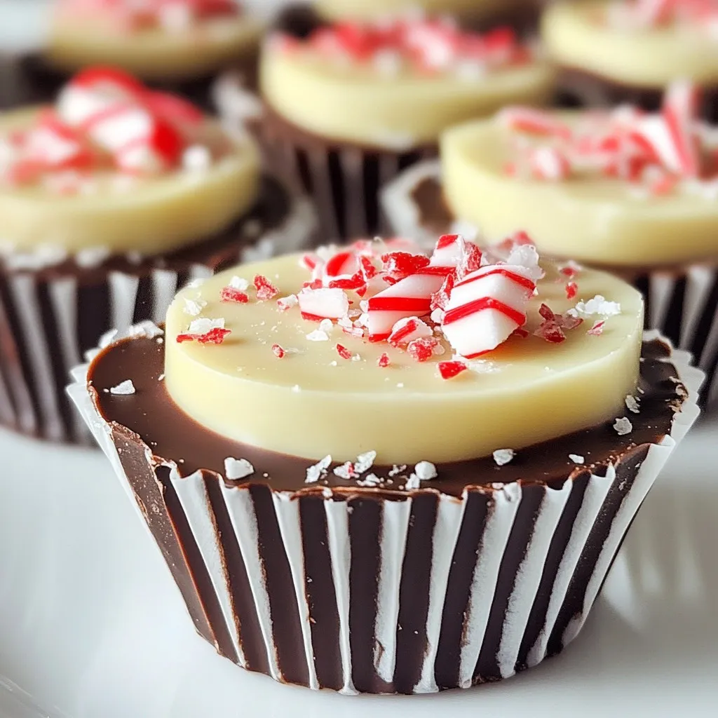 Delightful chocolate cups infused with peppermint and topped with crushed candy canes, perfect for the holidays.
