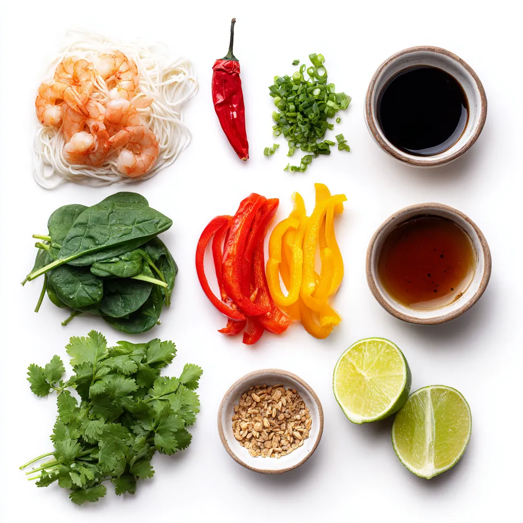 Gathering fresh ingredients is key for this dish. Use good quality shrimp for the best flavor. The rice noodles should be firm but tender. The garlic and chili bring a punch of flavor. The bell pepper adds color and crunch. Fresh lime juice brightens the dish. Brown sugar helps balance the spice with sweetness. I recommend using baby spinach for its mild taste.