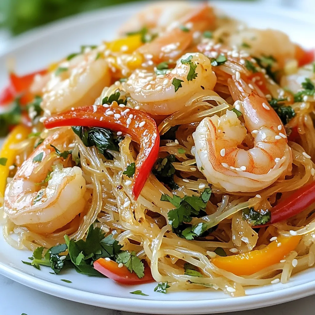 A flavorful dish featuring shrimp, rice noodles, and vibrant vegetables, all tossed in a spicy garlic sauce.