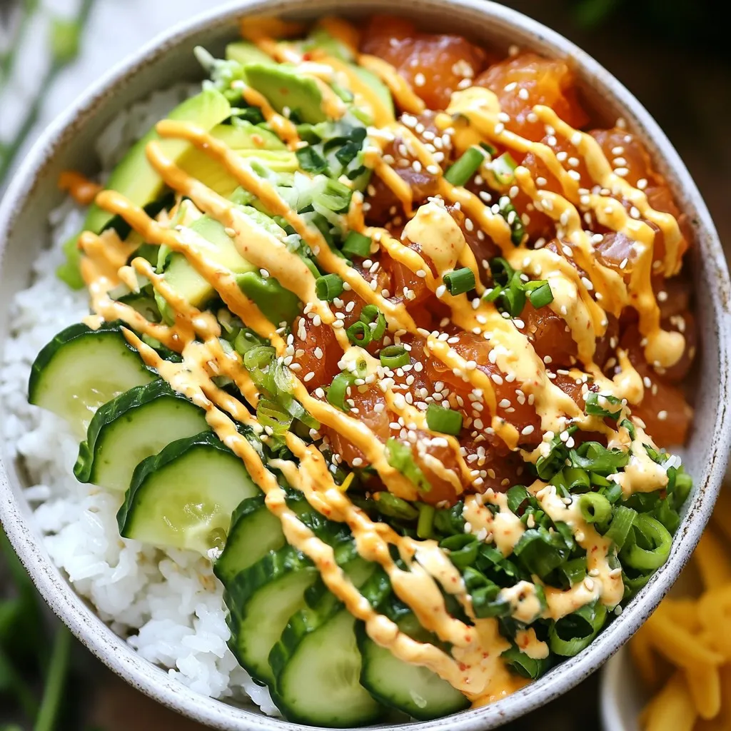 For serving, add a side of pickled ginger. It cleans your palate after the spicy tuna. Sprinkle sesame seeds on top for crunch. A pinch of sea salt enhances all the flavors. Each element brings a unique taste to your bowl, making it a delight to eat.