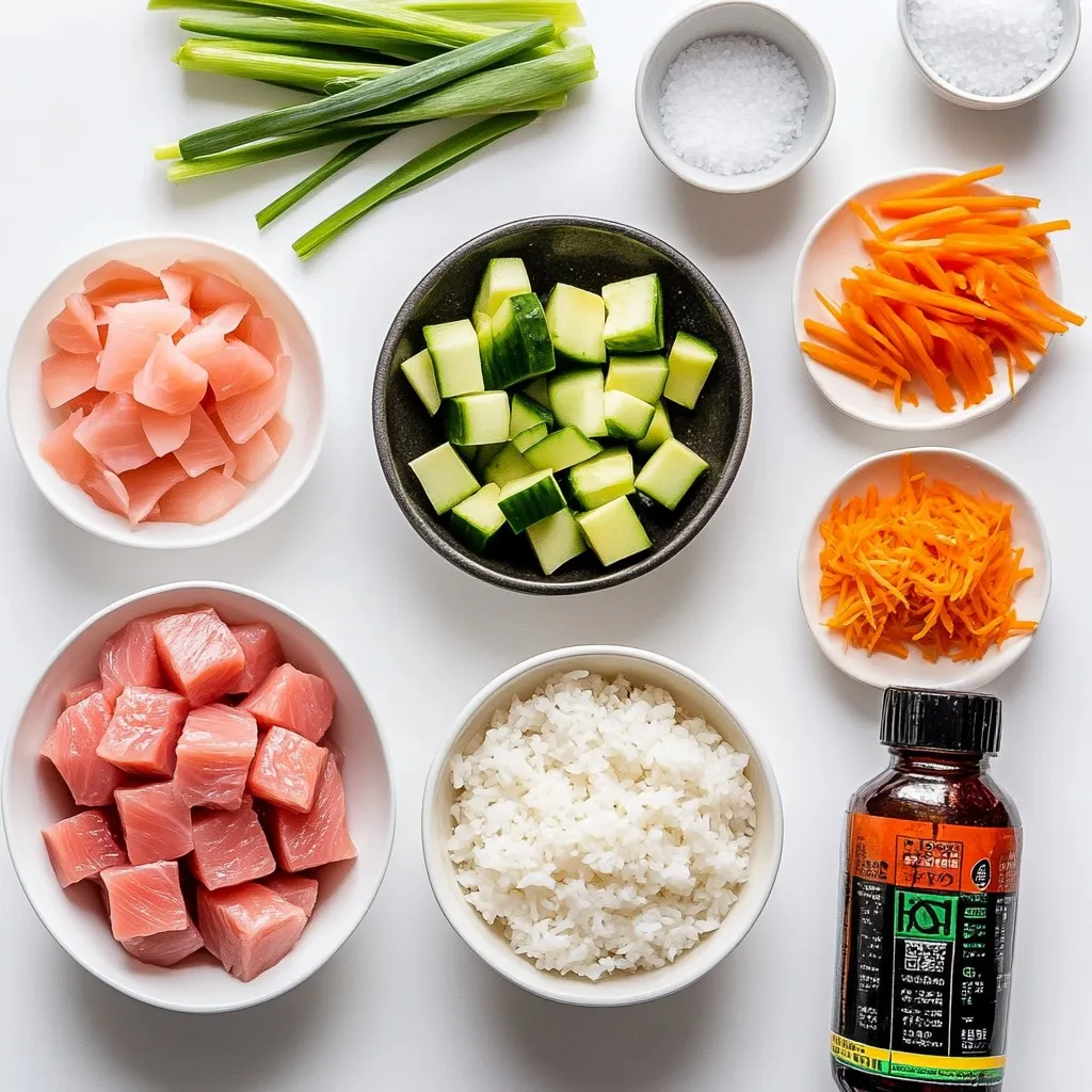 The main ingredients create the heart of the dish. You need sushi rice. Rinse it well to remove extra starch. This helps make it sticky. Use sushi-grade tuna for safety and taste. Dice it into small cubes. Combine it with mayonnaise, sriracha, and soy sauce. This mix brings flavor and a nice kick.