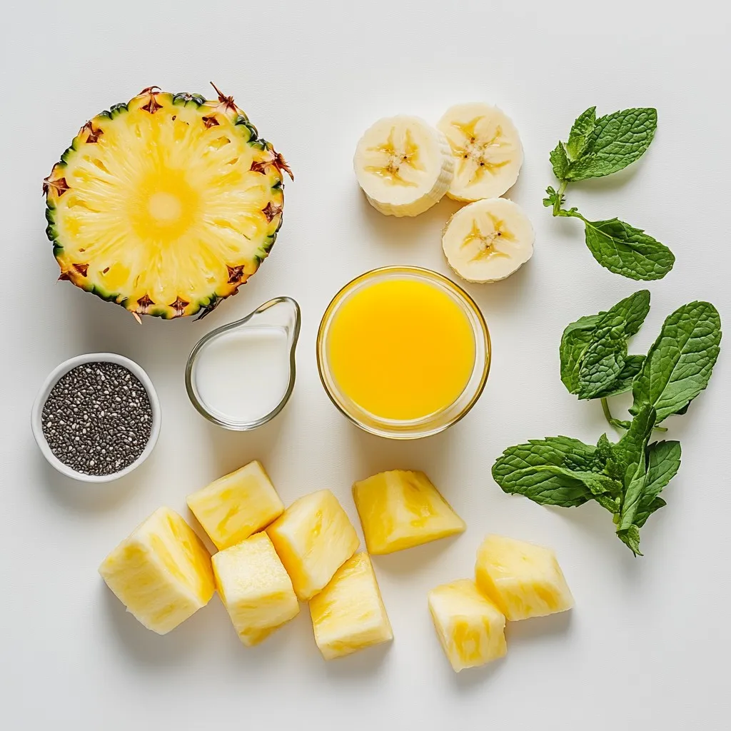Start by gathering your ingredients. You need a ripe banana, frozen pineapple chunks, coconut milk, freshly squeezed orange juice, honey or agave syrup, chia seeds, and fresh mint leaves.